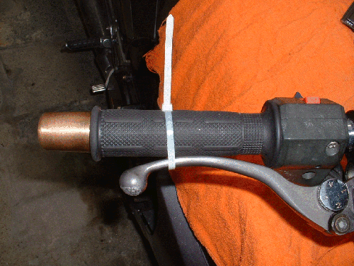 Den Bremshebel anziehen und feststellen. Hierzu kann ein Draht, Gummispanner oder wie hier ein Elektro-Kabelbinder verwendet werden.