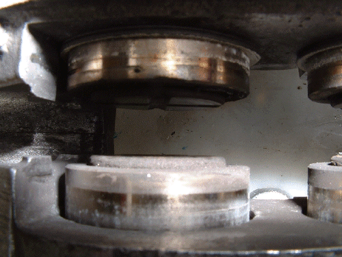 Innenliegende Kolbendichtungen, die obere erfüllt den Zweck einer Staubdichtung mehr schlecht als recht.