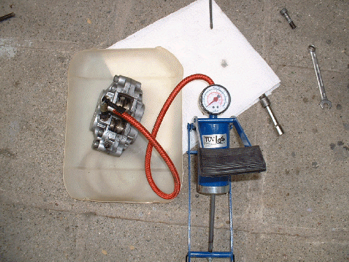 Hier habe ich die Bremskolben (an einer Kawasaki-Bremszange) mit einer Fusspumpe herausgedrückt. Mit dem komischen Luftmatratzenanschluss und dem kurzen Abschnitt eines Gummischlauches abgedichtet ging es passabel.