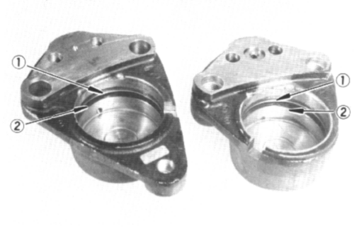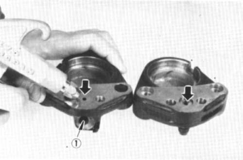 Bremszange der Baujahre 1978-79:  Hier muss abschliessend das Gelenk der Schwimmsattelbremse auf Leichtgängigkeit überprüft werden. Die Buchse mit Dichtungsring herausziehen und reinigen. Anschliessend mit frischem Kugellagerfett füllen und Buchse mit Dichtungsring wieder einbauen. Das Fett dient zur Schmierung und dann auch als Korrisionsschutz gegen eindringendes Wasser. Bremssattel mit der langen Schraube und Unterlegscheibe wieder am Träger festschrauben (Drehmoment lt. techn. Daten beachten!). Die Bremszange muss sich leicht hin- und herdrehen können.