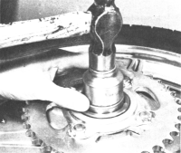 Zwischen beiden Lagern sitzt in der Radnabe eine Abstandshülse. Mit einer dünnen Eisenstange (ich verwende hierzu eine alte Kupplungsdrucksstange) oder einem starken Schraubenzieher  die Hülse seitlich verschieben und auf unteres Lager aufsetzen. Jetzt mit kräftigen Hammerschlägen, hierbei immer im Kreis herum fahren - um ein Verkanten des Lager zu vermeiden, das untere Lager heraustreiben.