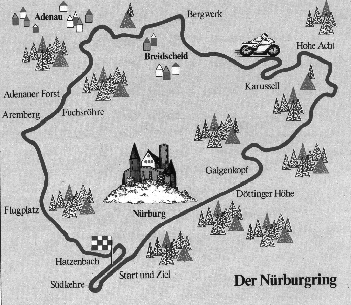 Keine Rennstrecke der Welt bietet ein solches Konzentrat an verscheidenen Fahrsituationen wie der traditionsreiche Ring in der Eifel. Insgesamt 172 Kurven, vier Geraden unterscheidlicher Länge und 300 Meter Höhenunterschied auf der Nordschleife stellen im Zeitraffer die höchsten Anforderungen an Mann wie Maschine.